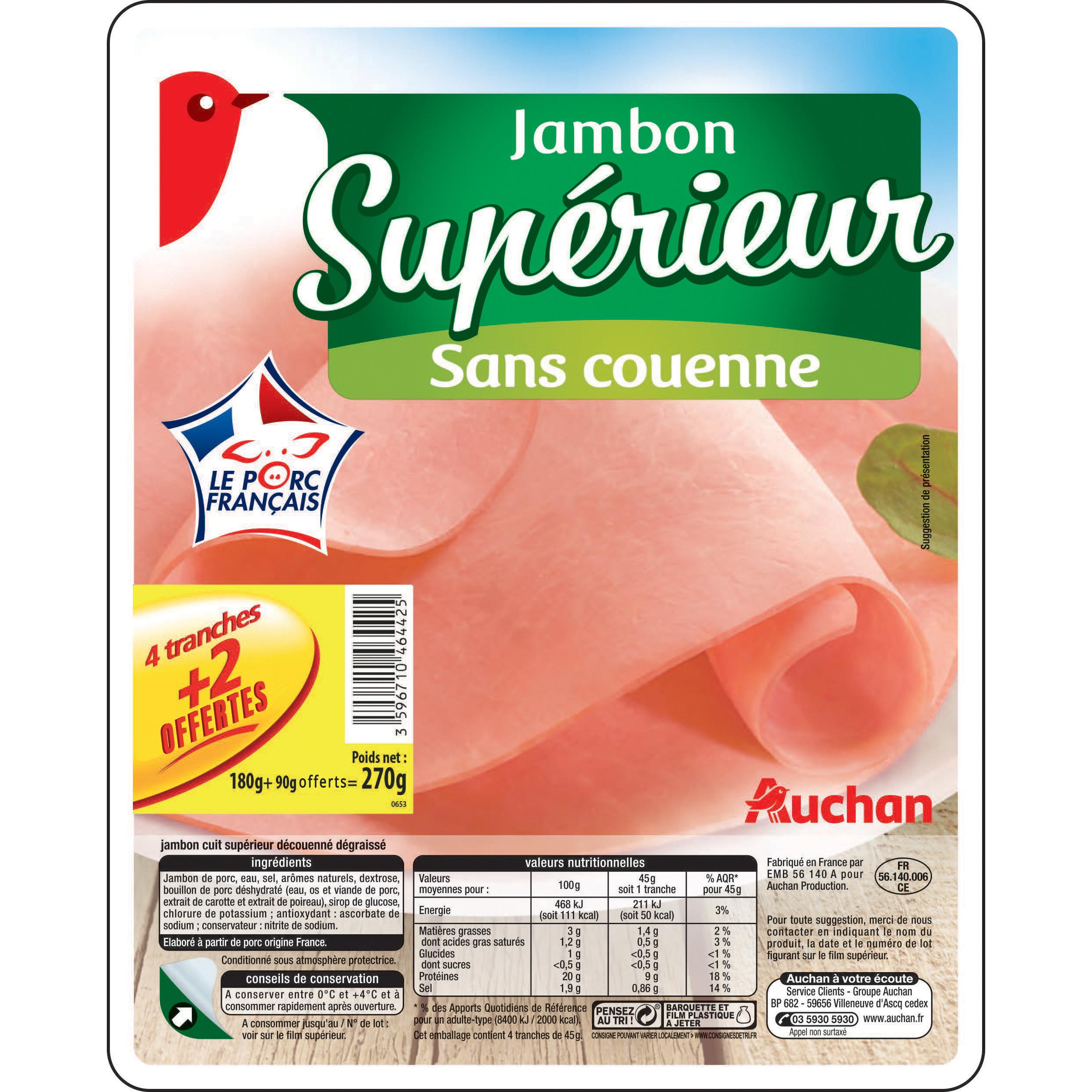 AUCHAN JAMBON SUPERIEUR DEGRAISSE SANS COUENNE 4 TRANCHES + 2 OFFERTES 270G
