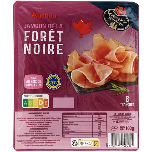 Ingrédients : Jambon de porc, sel, sirop de glucose, dextrose, extraits d'épices, épices, conservateurs : nitrite de sodium, nitrate de potassium ferments.Fumé au bois de conifère de la Forêt Noire.Elaboré à partir de porc origine UE.