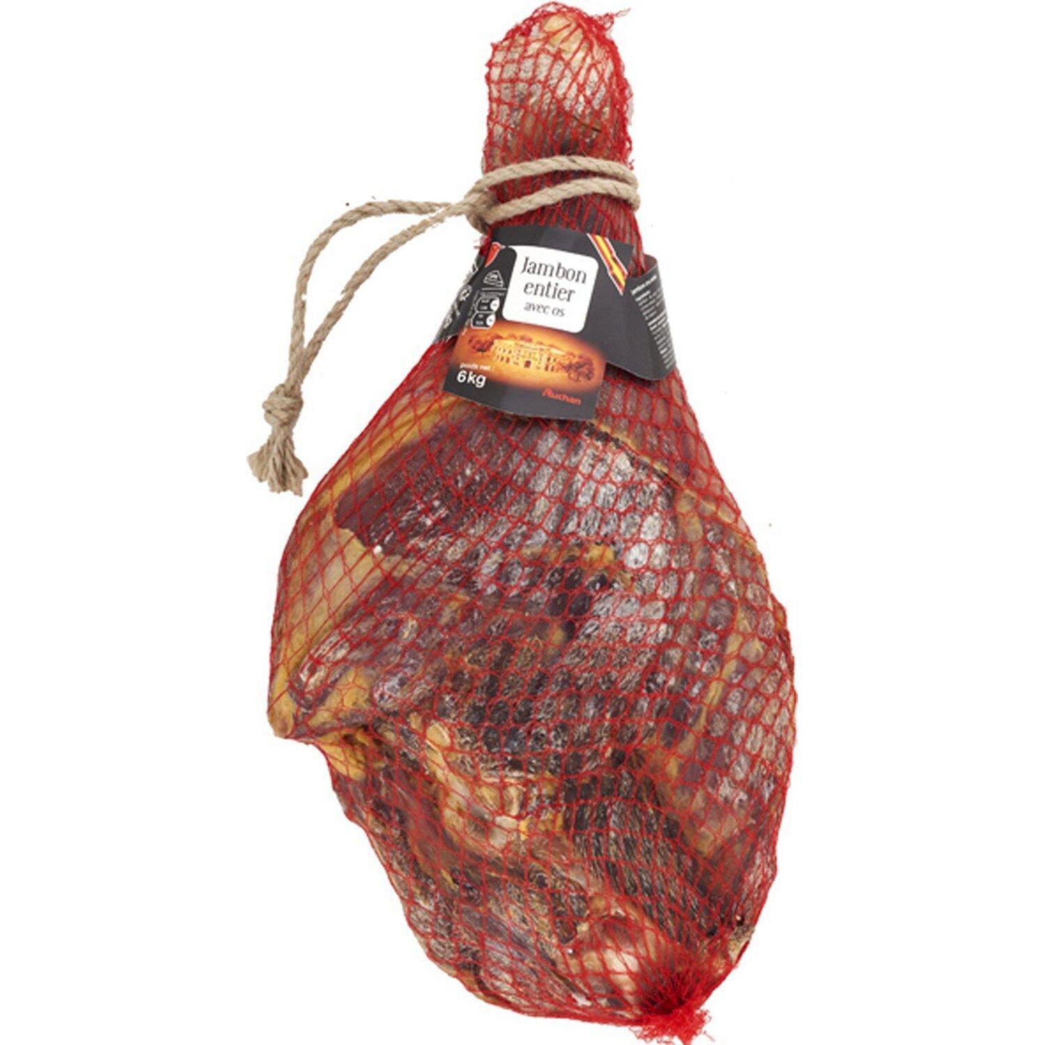 Un jambon sec Entier, affiné 6 mois, origine Espagne. Utilisez une griffe et un couteau pour la réussite du tranchage de ce jambon avec Os