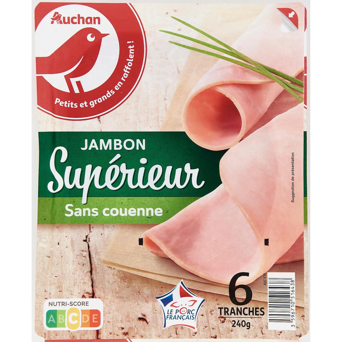 Ingrédients : Jambon de porc, sel, dextrose, antioxydant : ascorbate de sodium conservateur : nitrite de sodium. Élaboré à partir de porc origine France.