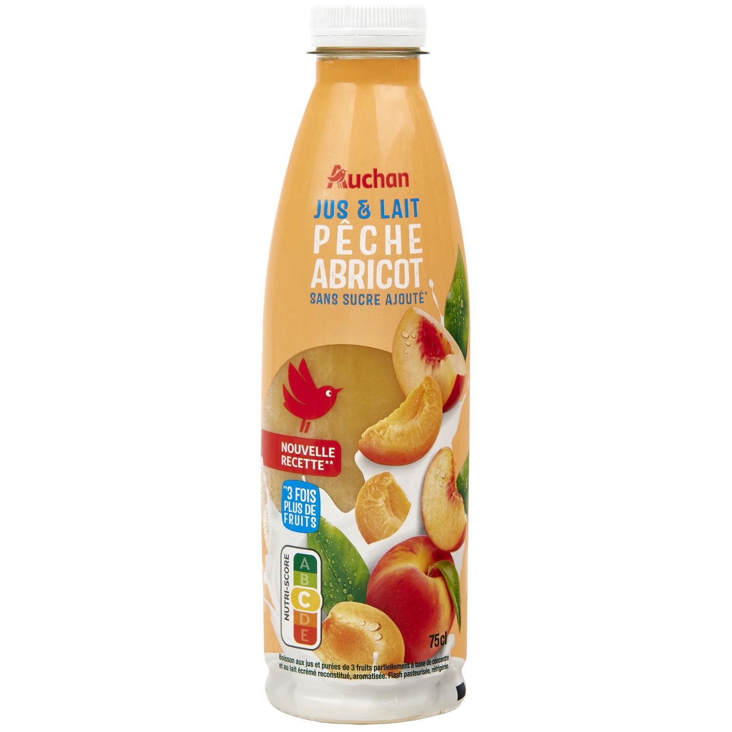 Ingrédients : Jus et purées de fruits partiellement à base de concentrés 81% (pomme 60%, pêche 18%, abricot 3%), LAIT écrémé reconstitué 15%, eau, stabilisant : pectine, arômes naturels, colorant : caroténoïdes, vitamines C et E. Elaboré avec du lait origine UE.
