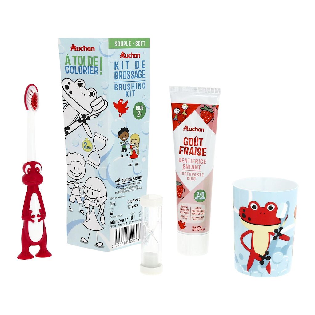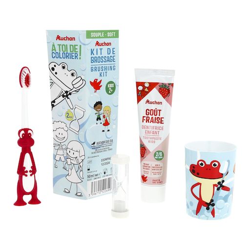 AUCHAN a developpé ce kit pour vos enfants à partir de 2 ans, il réunit une brosse à dent ventouse ludique, un dentifrice à la fraise et un verre à dent.