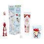kit de brossage de dents souplepetite tête tient debout grâce à ses ventouses inclus protège tête, gobelet, dentifrice et brosse à dents