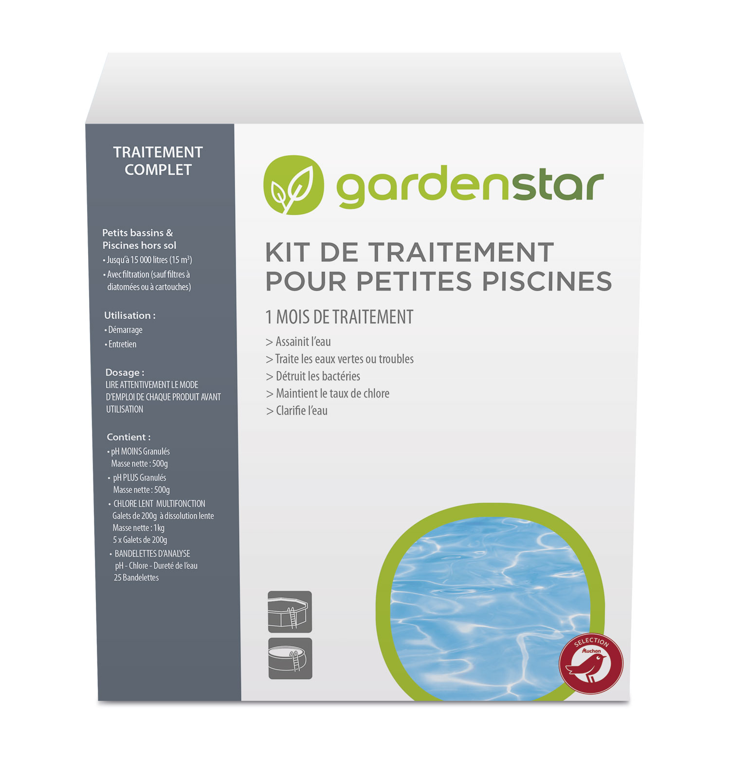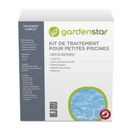Ce kit de traitement est à utiliser pour les piscines de 15 m3 maximum avec une filtration à sable. Ce kit vous permettra d’assainir l'eau,détruites les bactéries, maintenir le taux de chlore et de clarifier votre eau de bassin. Le kit Gardenstar contient une gamme complète de produits pour assurer la mise en route et le traitement quotidien pendant environ 1 mois.