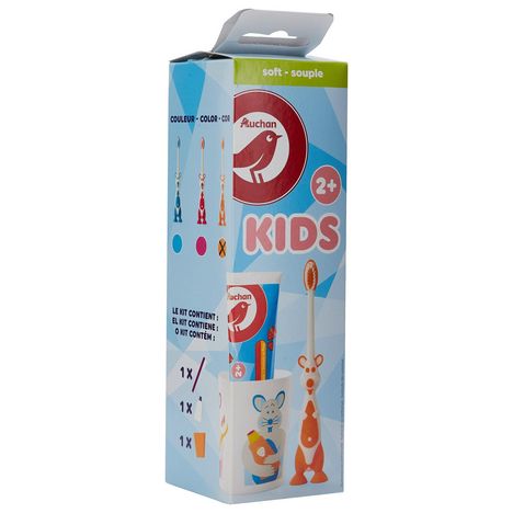 AUCHAN a developpé ce kit pour vos enfants à partir de 2 ans, il réunit une brosse à dent ventouse ludique, un dentifrice à la fraise et un verre à dent.