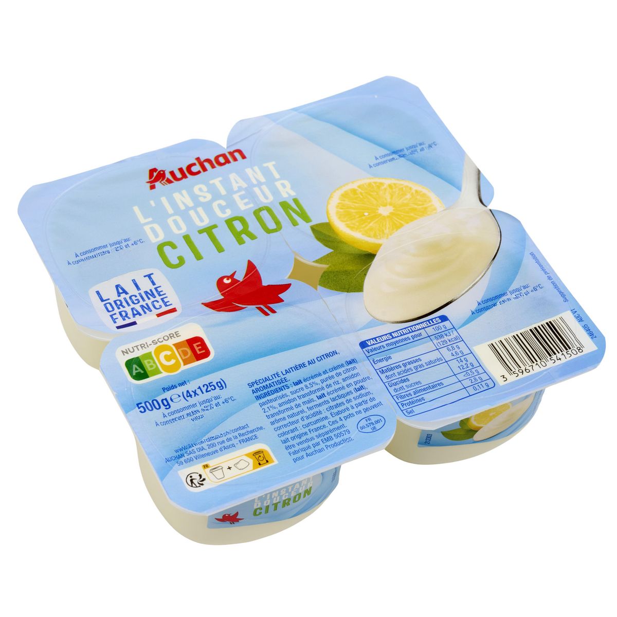 Ingrédients : LAIT écrémé et crème (LAIT) pasteurisés, sucre 8,5%, purée de citron 2,1%, amidon transformé de riz, amidon transformé de maïs, LAIT écrémé en poudre, arôme naturel, ferments lactiques (LAIT), correcteur d'acidité : citrates de sodium, colorant : curcumine.Elaboré à partir de lait origine France.