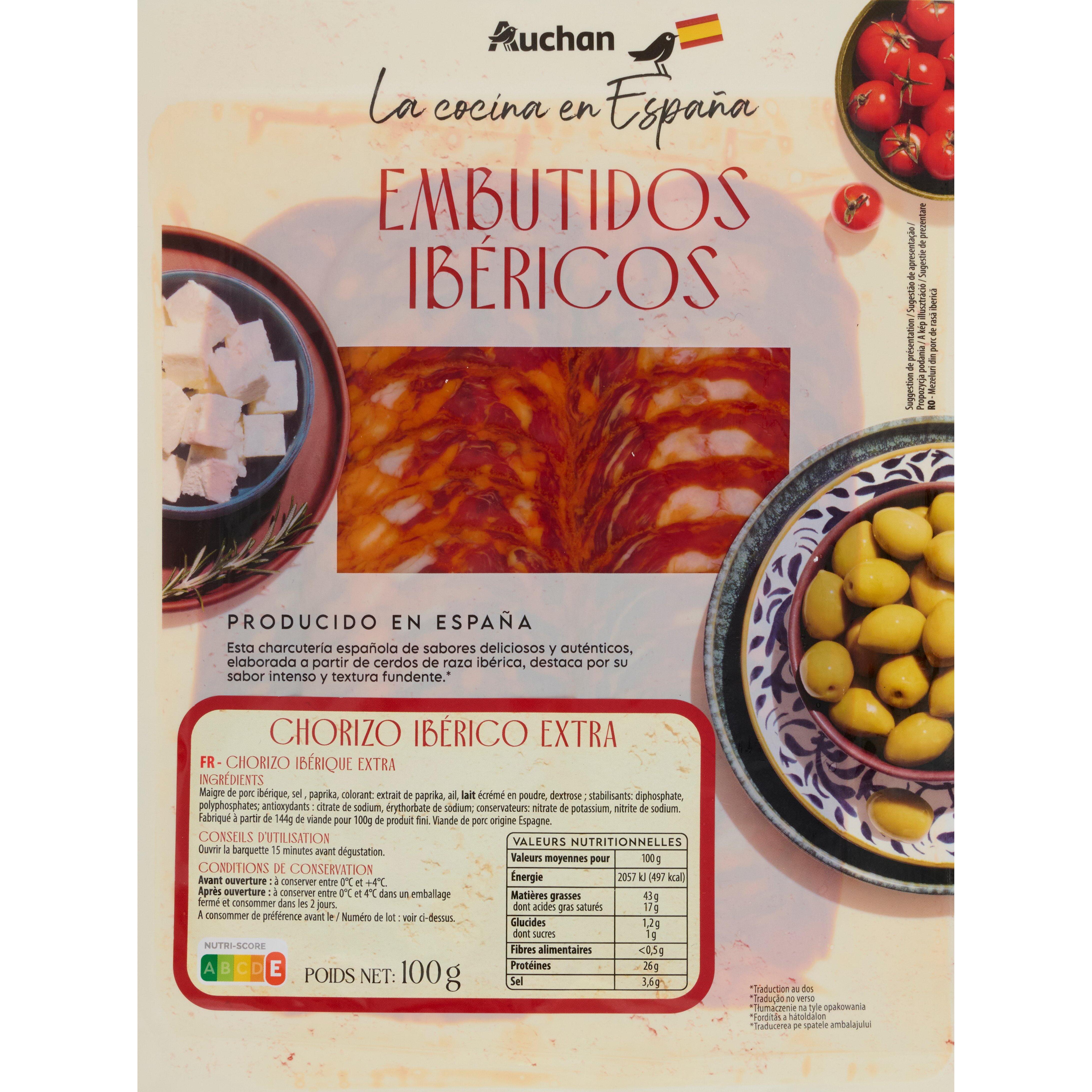 Ingrédients : Maigre de porc ibérique, sel , paprika, colorant: extrait de paprika, ail, LAIT écrémé en poudre, dextrose stabilisants: diphosphate, polyphosphates antioxydants : citrate de sodium, érythorbate de sodium conservateurs: nitrate de potassium, nitrite de sodium. Fabriqué à partir de 144g de viande pour 100g de produit fini. Viande de porc origine Espagne.