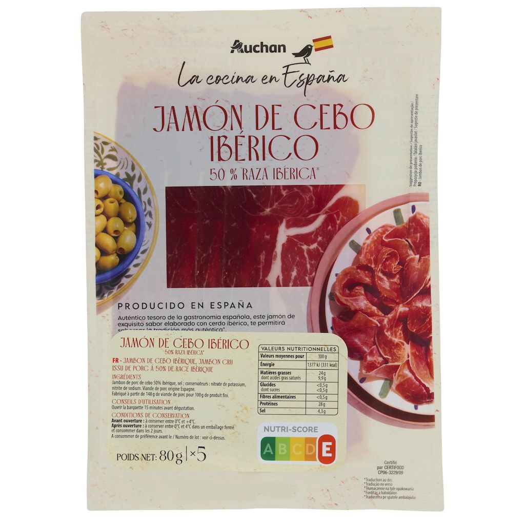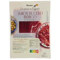 Ingrédients : Jambon de porc de cebo 50% ibérique , sel conservateurs: nitrate de potassium, nitrite de sodium.Fabriqué à partir de 148g de viande de porc pour 100g de produit fini. Viande de porc origine Espagne.
