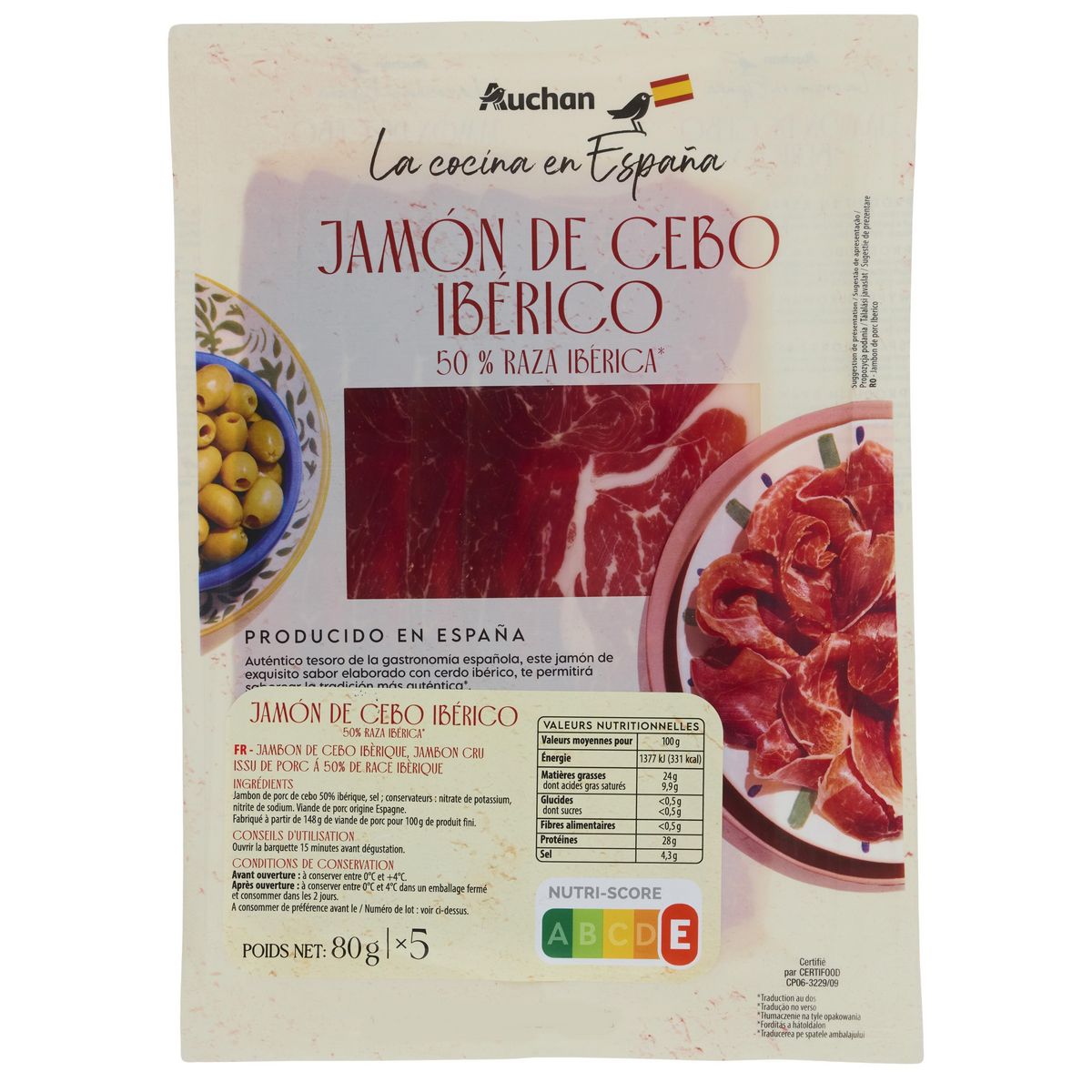Ingrédients : Jambon de porc de cebo 50% ibérique , sel conservateurs: nitrate de potassium, nitrite de sodium. Fabriqué à partir de 148g de viande de porc pour 100g de produit fini. Viande de porc origine Espagne.
