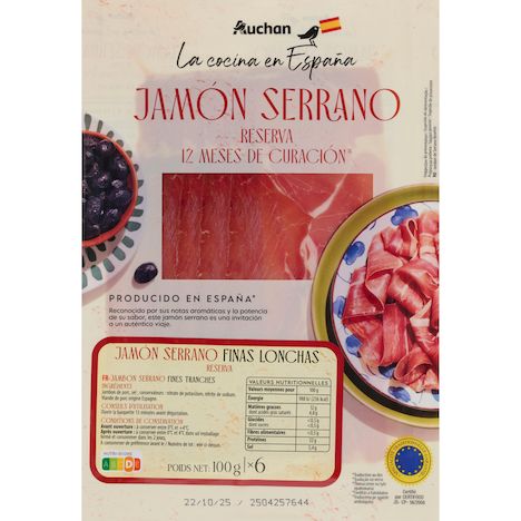 Ingrédients : Jambon de porc, sel conservateurs: nitrate de potassium, nitrite de sodium. Fabriqué à partir de 151g de viande de porc pour 100g de produit fini. Viande de porc origine Espagne.