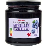 Ingrédients : Myrtilles, sucre, jus de citrons concentré, gélifiant : pectines. Préparée avec 65 g de fruits pour 100 g de produit fini.