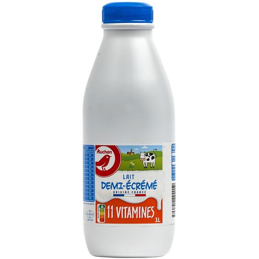 Un lait, collecté et conditionné en France, demi-écrémé, enrichi avec 11 vitamines, en bouteille en plastique 1L