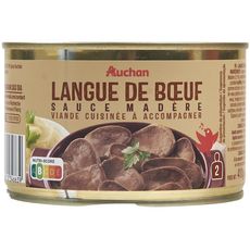 Ingrédients : Langue de bœuf (46%), eau,oignons, Madère (3.1%) (contient SULFITES),farine de BLÉ, vin blanc (contient SULFITES),Porto (contient SULFITES), fécule de pomme de terre, sel, huile de tournesol, sucre, fond blanc de veau (arômes naturels,plantes aromatiques, viande de veau), vinaigre de vin blanc (contient SULFITES), arômes naturels (contient SULFITES), épaississant : gomme de xanthane, émulsifiant : cellulose(origine végétale), poivre. Elaboré à partir de viande origine Amérique du Sud et Madère origine UE.