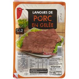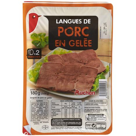 Ingrédients : Langues de porc 84%, gelée 16% (eau, gélatine de porc, sel, dextrose, acidifiant : acide citrique, colorant : caramel ordinaire, conservateur : sorbate de potassium, gélifiant : carraghénanes, épaississant: gomme xanthane, arômes), sel stabilisants : diphosphates, triphosphates dextrose, farine de MOUTARDE antioxydants : érythorbate de sodium, ascorbate de sodium arômes naturels, conservateur : nitrite de sodium, vinaigre. Elaboré à partir de porc origine UE.