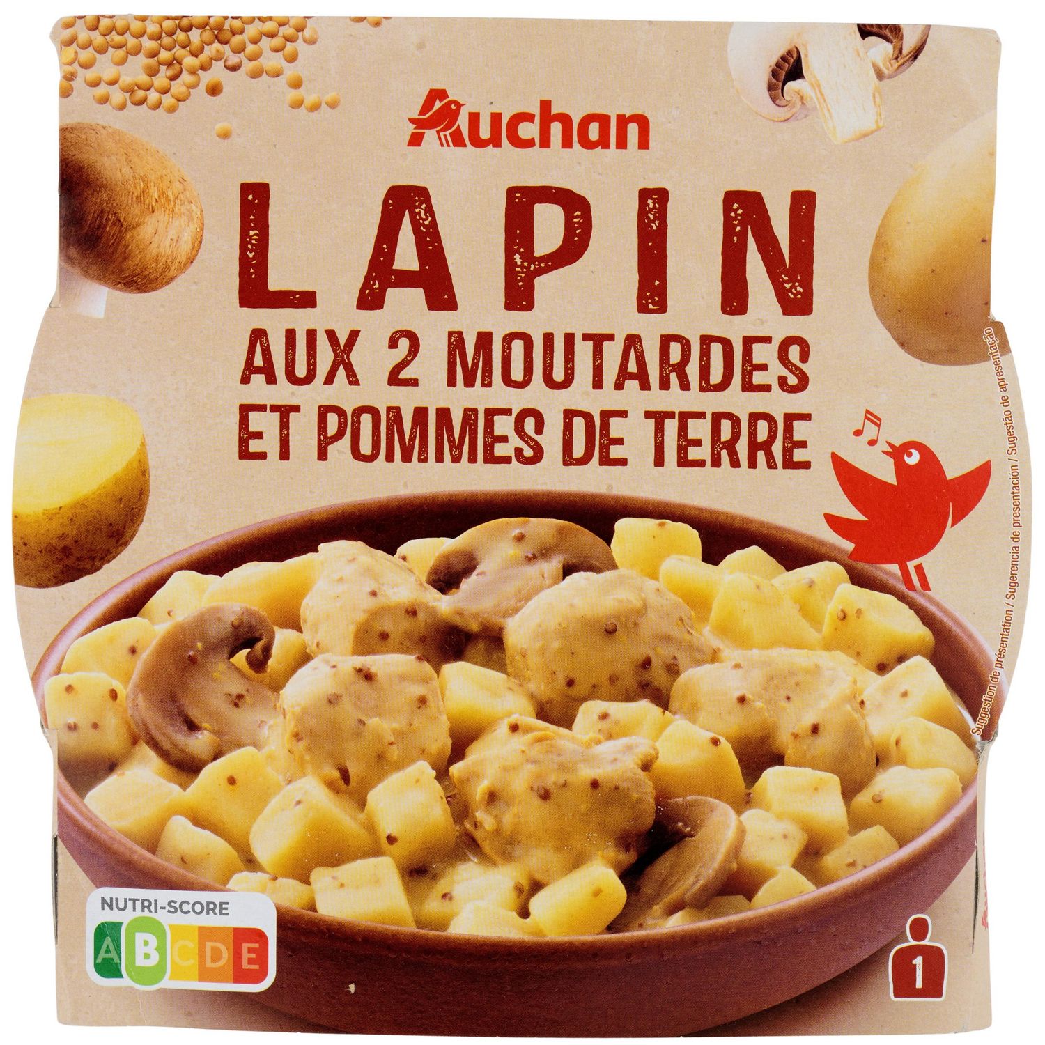Ingrédients : Pommes de terre 30% (antioxydant : acide ascorbique, conservateur : DISULFITE de sodium), viande de lapin traitée en salaison précuite 25% (viande de lapin 23% (origine UE), eau, sel, amidon de pois), eau, champignons de Paris 6%, MOUTARDE de Dijon 6% (eau, graines de MOUTARDE, vinaigre d'alcool, sel, conservateur : SULFITE acide de sodium), crème (LAIT origine UE), MOUTARDE à l'ancienne 3% (eau, graines de MOUTARDE, vinaigre d'alcool, sel), amidon modifié de maïs, huile de colza, vin blanc, sucre, épices et plantes aromatiques (ail, oignon et curcuma en poudre), gélifiants : gomme guar, gomme xanthane, poivre. Traces éventuelles de céréales contenant du gluten, œuf, poisson, soja, fruits à coque, mollusques. Pourcentages exprimés sur le total de la recette.