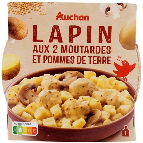 Plat aux 2 moutardes à base de pommes de terre, viande de lapin traitée en salaison, précuite et champignons.Avant ouverture : craint la chaleur et l'humiditéAprés ouverture : A conserver 24h au réfrigérateur