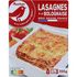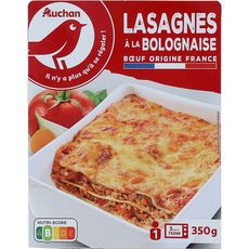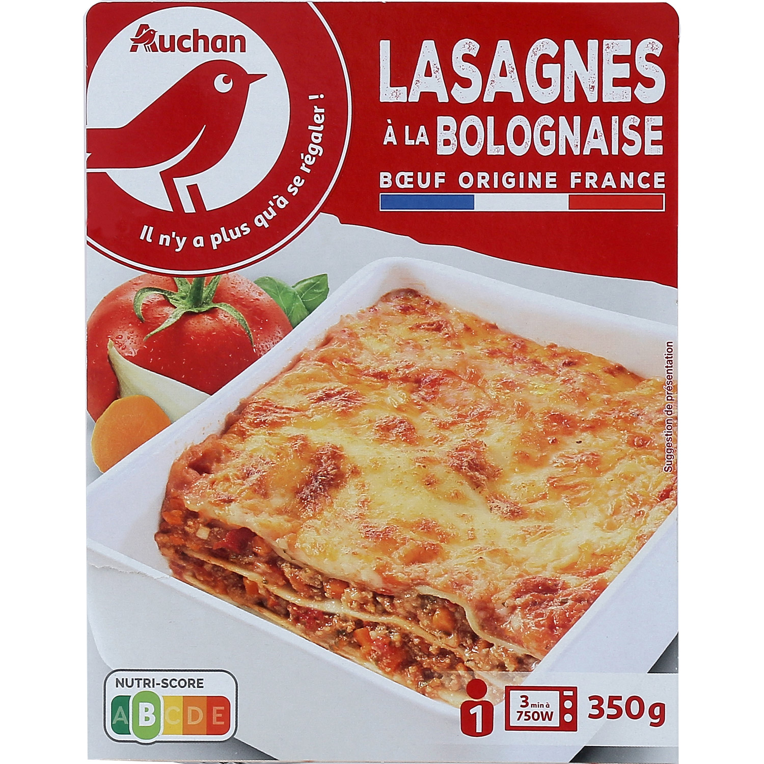 Sauce à la bolognaise 60,2% [eau, tomates 14,4% (tomates pelées concassées et jus de tomates), viande de boeuf 12,2%, carottes 2.2%, oignons 2.2%, concentré de tomates 2,0%, amidon transformé de maïs, vin blanc, huile de colza, basilic 0.4%, ail, sel, sucre, arôme naturel de poivre, thym], sauce blanche 26,7% [lait écrémé en poudre réhydraté, eau, amidon transformé de maïs, crème fraîche (lait), farine de blé, sel, arôme naturel de muscade et autres épices], pâtes à lasagne sèche 9,6% [semoule de blé dur, eau], gratinage 3,5% [emmental (lait)]. Pourcentages exprimés sur le total de la recette.Traces éventuelles de soja, poisson, crustacés, mollusques, oeuf, et moutarde.