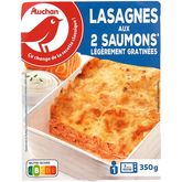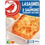 Eau, saumon rose du Pacifique (poisson) 11,5% (Oncorhynchus gorbuscha), feuilles de lasagnes 9,5% (semoule de blé dur, eau), crème fraiche 8% (lait), amidon transformé de maïs, lait écrémé en poudre, emmental 2,4% (lait), saumon (poisson) fumé 2,4% (saumon Salmo salar, sel), concentré de tomates, huile de colza, farine de blé, ciboulette 0.4%, fumet de poisson (chair et jus de poisson, sel), sel, jus de citron concentré, arôme naturel de poivre, arôme naturel de muscade. Pourcentages exprimés sur le total de la recette.Traces éventuelles de soja, crustacé, mollusques, oeuf et moutarde