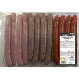 Assortiment idéal pour le barbecue, composé de 4 merguez, 4 chipolatas et 4 chipolatas aux herbes