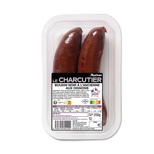 Ingrédients : Sang de porc (origine France), oignons cuits 37%, gras de porc (origine France) , couenne de porc (origine France), sel, sucre, épices, plantes aromatiques, boyau naturel de porc.Traces éventuelles de : gluten, lait, oeufs, moutarde, fruits à coque, mollusques. Conditionné sous atmosphère protectrice.