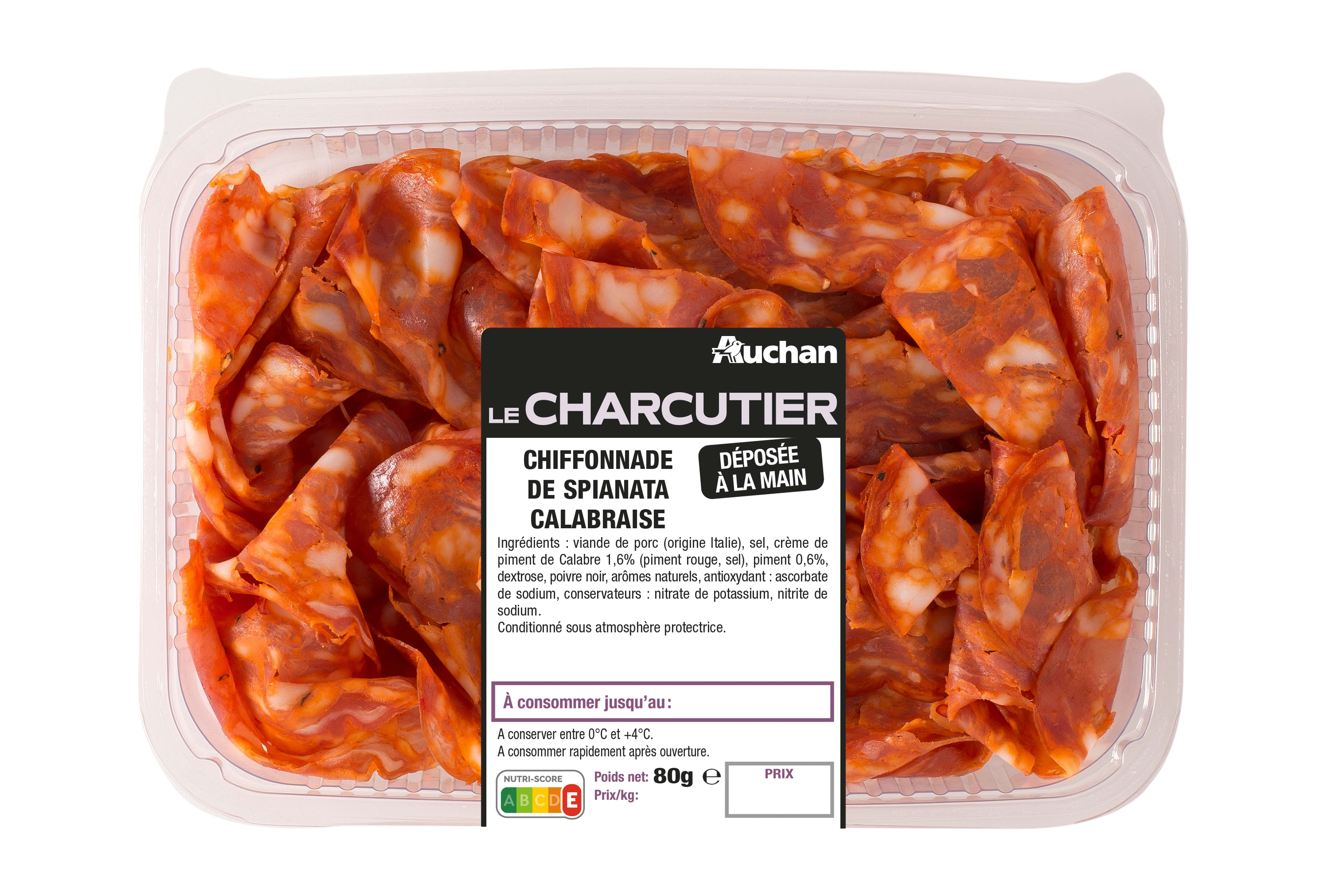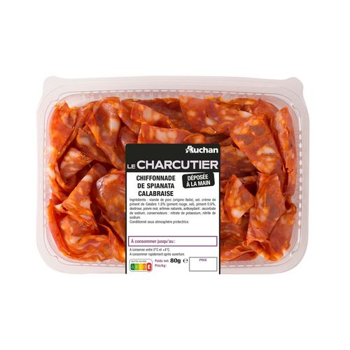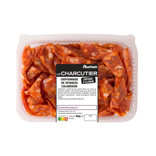 Ingrédients : Viande de porc (origine Italie), sel, crème de piment de Calabre 1, 6% (piment rouge, sel), piment 0,6%, dextrose, poivre noir, arômes naturels, antioxydant : ascorbate de sodium, conservateurs : nitrate de potassium, nitrite de sodium. % exprimés sur le total de la recette. 145 g de viande de porc mise en œuvre pour 100 g de produit fini.
