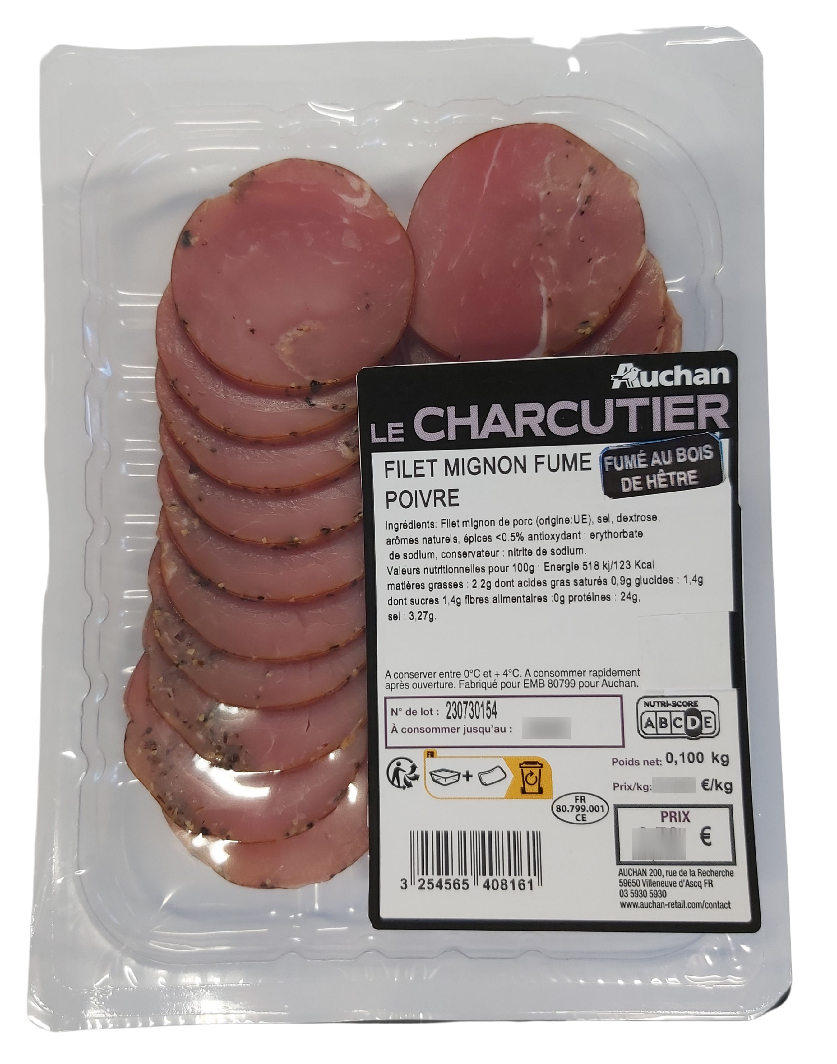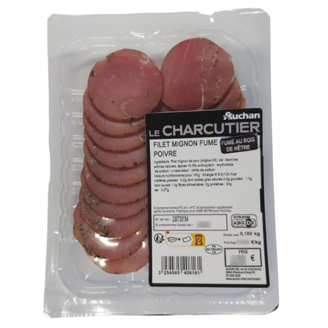Ingrédients : Filet mignon de porc (origine : Espagne), sel, épices (0.6%), dextrose, plantes aromatiques, arômes naturels, antioxydant : Erythorbate de sodium, conservateur: nitrite de sodium