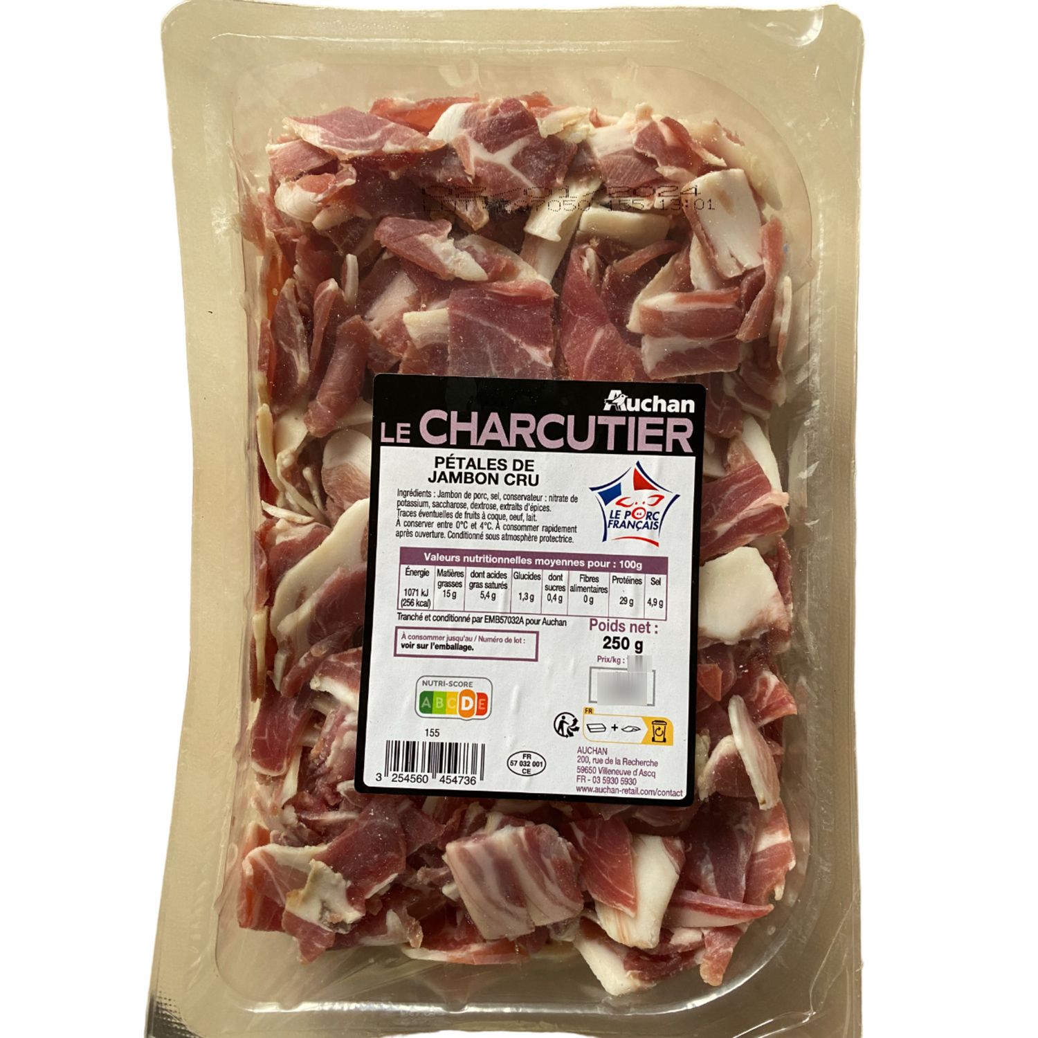 Bonjour 56blyon, Je suis désolé d'apprendre que vous avez eu une expérience aussi décevante avec notre jambon cru en pétales Auchan le charcutier Votre avis est très important pour nous, car il nous permet d'améliorer constamment la qualité de nos produits. Parfois, il arrive qu'il y ait un défaut de production, car ce sont des talons de jambons qui sont utilisés et donc par nature ils sont irréguliers. A bientôt chez Auchan