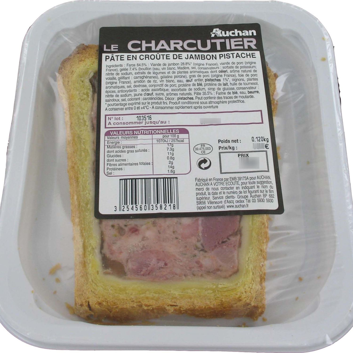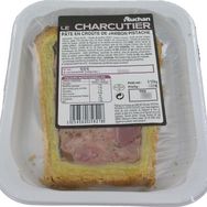 Ingrédients : Farce 64.5%: Viande de jambon 28.8%* (origine France), viande de porc, gelée (bouillon (eau, vin blanc, Madère, sel, conservateurs: sorbate de potassium, nitrite de sodium, extraits de légumes et de plantes aromatiques dont CELERI, arôme naturel de volaille, gélifiant: carraghénanes), gélatine porcine), gras de porc, foie de porc, amidon de riz, vin blanc, eau, OEUF entier, PISTACHES 1%*, oignons, plantes aromatiques, sel, dextrose, tissu conjonctif de porc, protéine de BLE, protéine de LAIT, huile de tournesol, épices, antioxydants: acide ascorbique, ascorbate de sodium, sirop de glucose, conservateur: nitrite de sodium, jaune d'OEUF, sucre, arômes naturels. Pâte 35.5%: Farine de BLE, eau, BEURRE, saindoux, sel, épice. Décor: PISTACHES. Peut contenir des traces de FRUITS A COQUE, MOUTARDE, POISSONS, MOLLUSQUES et CRUSTACES.* Pourcentage exprimé sur le produit fini.
