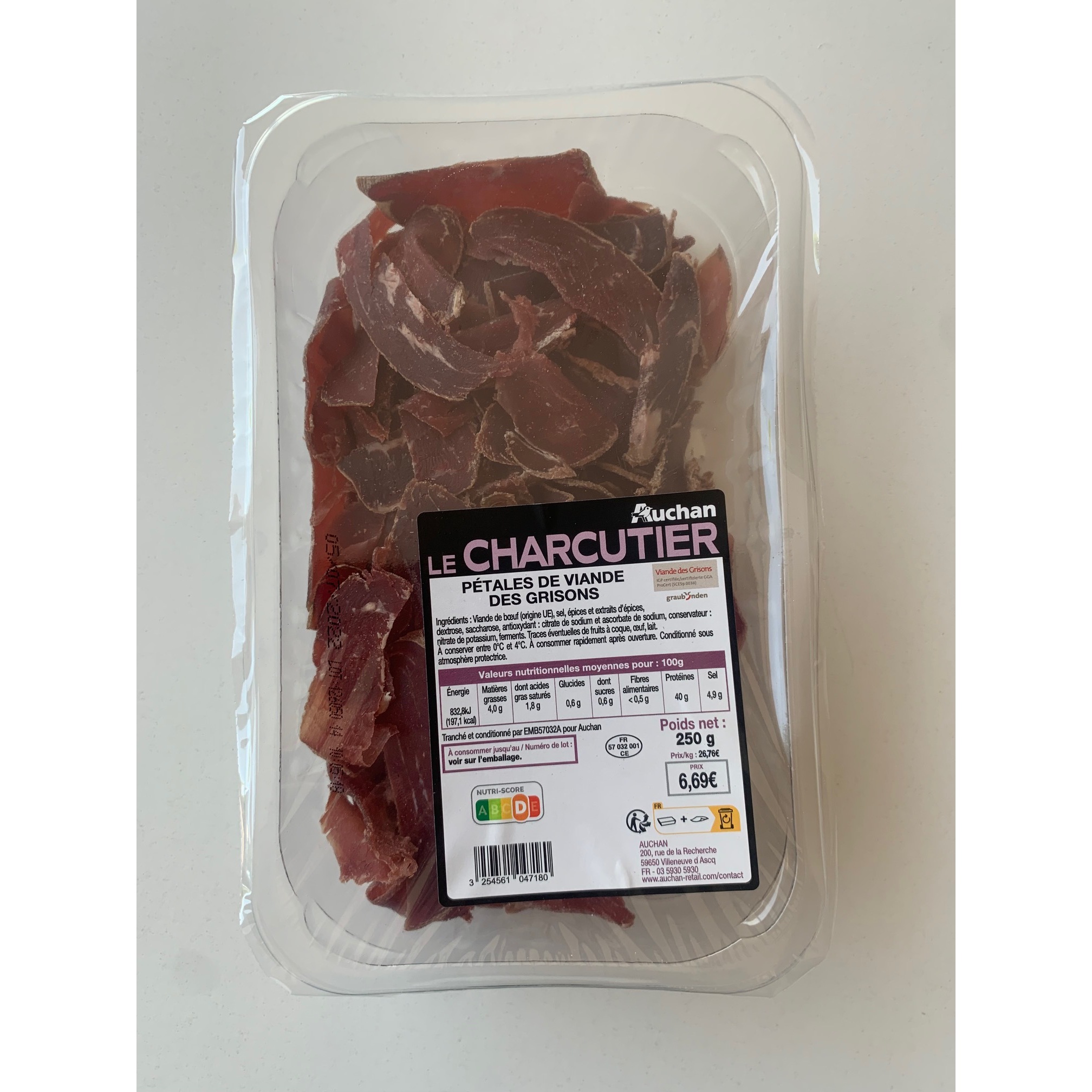 Bonjour BERNARD, nous sommes désolés d'apprendre que vous n'avez pas été satisfait des pétales de viande des Grisons. Nous nous excusons pour cette expérience décevante. Merci pour votre avis, celui contribue à améliorer notre produit AUCHAN LE CHARCUTIER. Bonne journée.