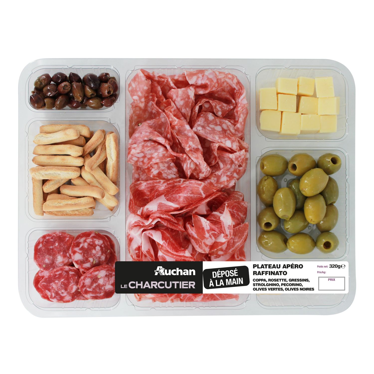 lactiques, présure d'agneau), Olives vertes 24% (olives, sel, huile de tournesol), Olives noires 6% (olives