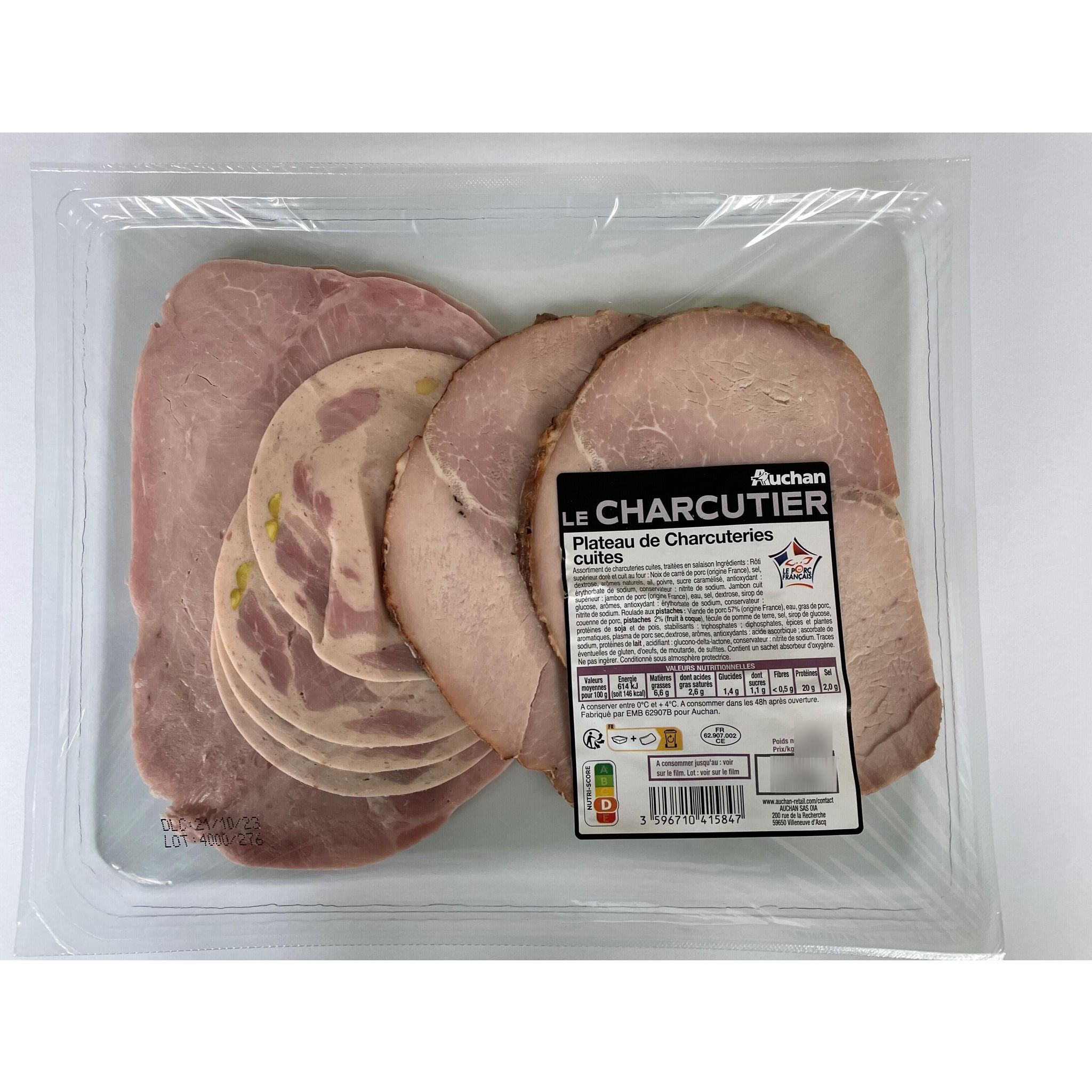 Assortiment de charcuteries cuites, traitées en salaison : Rôti de porc supérieur doré et cuit au four : Noix de carré de porc (origine France), sel, dextrose, arômes naturels, ail, poivre, sucre caramélisé, antioxydant : érythorbate de sodium, conservateur : nitrite de sodium. Jambon cuit supérieur : jambon de porc (origine France), eau, sel, dextrose, sirop de glucose, arômes, antioxydant : érythorbate de sodium, conservateur : nitrite de sodium. Roulade aux PISTACHES : viande de porc 57 % (origine France), eau, gras de porc, couenne de porc, PISTACHES (2%) FRUIT A COQUE, fécule de pomme de terre, sel, sirop de glucose, protéines de SOJA et de pois, stabilisants : triphosphates : diphosphates, épices et plantes aromatiques, plasma de porc sec, dextrose, arômes, antioxydants : acide ascorbique ; ascorbate de sodium, protéines de LAIT, acidifiant : glucono-delta-lactone, conservateur : nitrite de sodium. Traces éventuelles de gluten, d'œufs, de moutarde, de sulfites. Contient un sachet absorbeur d'oxygène (ne pas ingérer). Conditionné sous atmosphère protectrice.