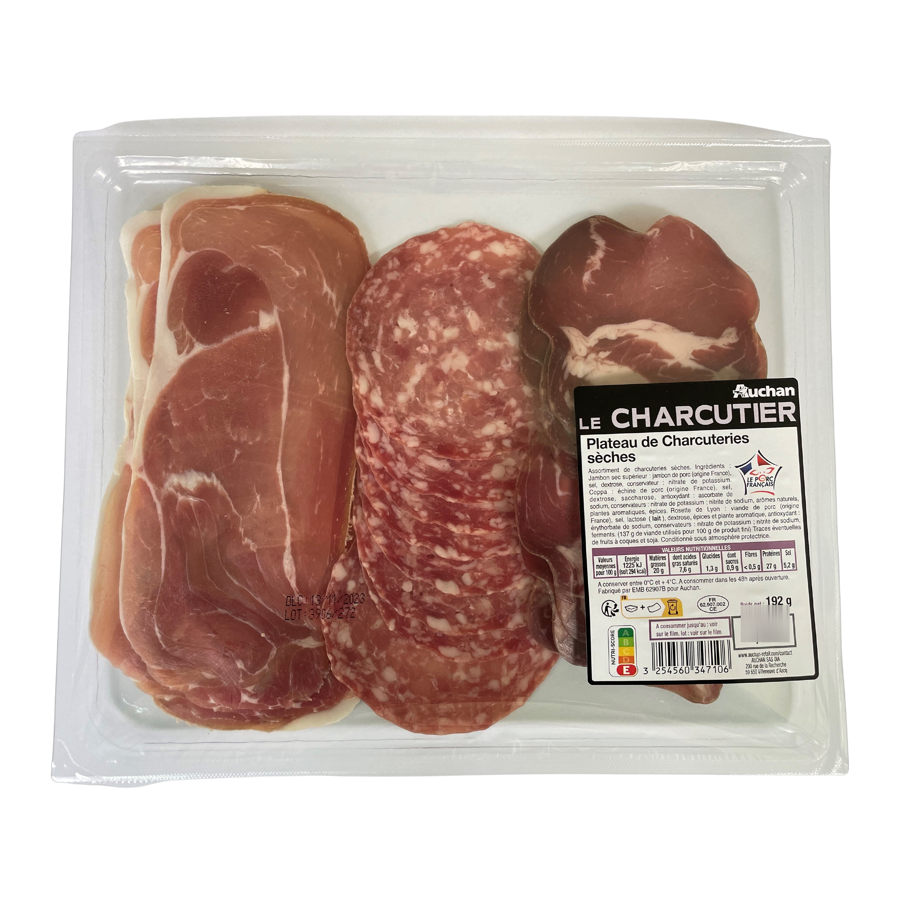 Jambon sec supérieur de Savoie : jambon de porc (origine France), sel, conservateur : nitrate de potassium. Coppa : échine de porc (origine France), sel, dextrose, saccharose, antioxydant : ascorbate de sodium, conservateurs : nitrate de potassium : nitrite de sodium, arômes naturels, plantes aromatiques, épices. Rosette de Lyon : viande de porc (origine France), sel, lactose (LAIT), dextrose, épices, ail, antioxydant : érythorbate de sodium, conservateurs : nitrate de potassium,: nitrite de sodium, ferments. (137g de viande utilisés pour 100 g de produit finie). Traces éventuelles de fruits à coque et soja. conditionné sous atmosphère protectrice.
