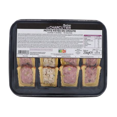 Ingrédients : Petit pâté en croûte jambon et pistaches: farine de blé, viande de jambon (origine France) 22%, eau, gelée 10.9% (bouillon (eau, vin blanc, Madère, sel, arômes naturels (dont céleri), conservateurs (sorbate de potassium, nitrite de sodium), gélifiant: carraghénanes), gélatine porcine), margarine (matière grasse végétale: palme, eau, huile végétale: colza, sel, jus de citron concentré), viande de porc (origine France), gras de porc (origine France), foie de porc (origine France), sel, amidon de riz, vin blanc, oeuf entier, oignons rissolés (oignons, huile de tournesol), pistaches 0,8%, plantes aromatiques, dextrose, tissu conjonctif de porc, protéine de blé, protéine de lait, épices, antioxydants (ascorbate de sodium, acide ascorbique), sirop de glucose, conservateur: nitrite de sodium, arômes naturels. Petit pâté en croûte aux 2 olives: farine de blé, viande de porc (origine France), gelée 11,9% (bouillon (eau, vin blanc, Madère, sel, arômes naturels (dont céleri), conservateurs (sorbate de potassium, nitrite de sodium), gélifiant: carraghénanes), gélatine porcine), margarine (matière grasse végétale: palme, eau, huile végétale: colza, sel, jus de citron concentré), eau, olives vertes et noires 4% (olives, sel), gras de porc (origine France), jaune d'oeuf, foie de porc (origine France), foie de poulet (origine France), sel, vin blanc, Brandy, plantes aromatiques, sirop de glucose, épices, antioxydant: ascorbate de sodium, conservateur: nitrite de sodium, arômes naturels. Petit pâté en croûte poulet et moutarde à l'ancienne: farine de blé, viande de poulet (origine France) 24%, gelée 10,9% (bouillon (eau, vin blanc, Madère, sel, arômes naturels (dont céleri), conservateurs (sorbate de potassium, nitrite de sodium), gélifiant: carraghénanes), gélatine porcine), margarine (matière grasse végétale: palme, eau, huile végétale: colza, sel, jus de citron concentré), eau, crème (crème de lait), lait, poireaux, moutarde à l'ancienne 2% (eau, graines de moutarde, vinaigre d'alcool, sel, vin blanc , sucre, épices, acidifiant: acide citrique, conservateur: disulfite de potassium), Madère, sel, oeuf entier, sirop de glucose, gélatine porcine, beurre, huile de tournesol, ail, jus de citron, épices, antioxydant: acide ascorbique. Petit pâté en croûte morilles et champignons noirs: farine de blé, viande de porc (origine France), gelée 11,9% (bouillon (eau, vin blanc, Madère, sel, arômes naturels (dont céleri), conservateurs (sorbate de potassium, nitrite de sodium), gélifiant: carraghénanes), gélatine porcine), margarine (matière grasse végétale: palme, eau, huile végétale: colza, sel, jus de citron concentré), eau, gras de porc (origine France), jaune d'oeuf, foie de porc (origine France), foie de poulet(origine France), sel, morilles 1,2%, champignons noirs 1,2%, vin blanc, Brandy, plantes aromatiques, crème, sirop de glucose, beurre, épices, antioxydant: ascorbate de sodium, huile de tournesol, conservateur: nitrite de sodium, arômes naturels. Peut contenir des traces de fruits à coque, poissons, crustacés et mollusques.