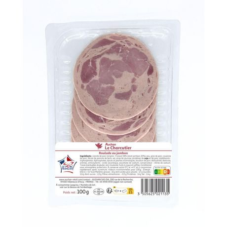 La roulade au jambon est composée d’une farce fine de porc, avec des morceaux de jambon.