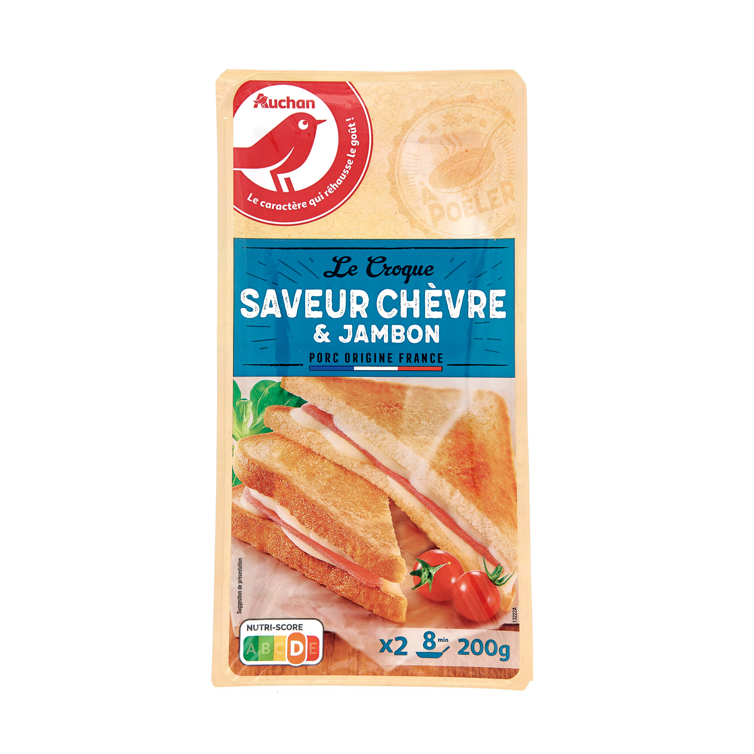 Ingrédients : Pain de mie nature 53.4% (farine de BLÉ, eau, dextrose, huile de colza, gluten de BLÉ, levure, sel, conservateur: propionate de calcium agent de traitement de la farine: acide ascorbique), fromage fondu au fromage de chèvre (LAIT) 23.8% (fromage de chèvre (LAIT) 14.2%, eau, fromages (LAIT), amidons modifiés, protéines de LAIT, beurre (LAIT) sels de fonte: citrates de sodium, phosphates de sodium, polyphosphates LAIT écrémé en poudre, arôme gélifiant: carraghénanes), jambon cuit standard 17.8% (jambon de porc 11.7%, eau,dextrose, sel, lactose (LAIT), arômes émulsifiant:diphosphates antioxydant: ascorbate de sodium conservateur : nitrite de sodium), matière grasse composée (huile de colza raffinée, BEURRE concentré (LAIT)). Elaboré à partir de porc origine France et de lait origine UE, non UE.Pourcentages exprimés sur le total de la recette.