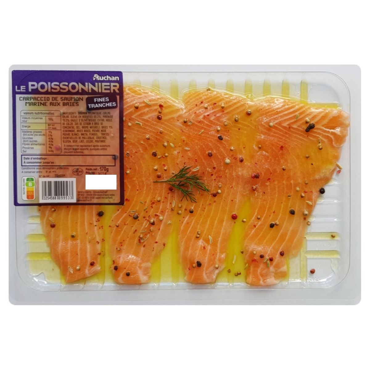Saumon Atlantique (Salmo salar, élevé en Norvège) 85%, huile d'olive vierge extra 5%, huile de colza, jus de citron à base de concentré 1.3%, aneth, coriandre, baie rose, sel, poivre blanc, poivre noir, fenouil, arôme naturel de basilic.