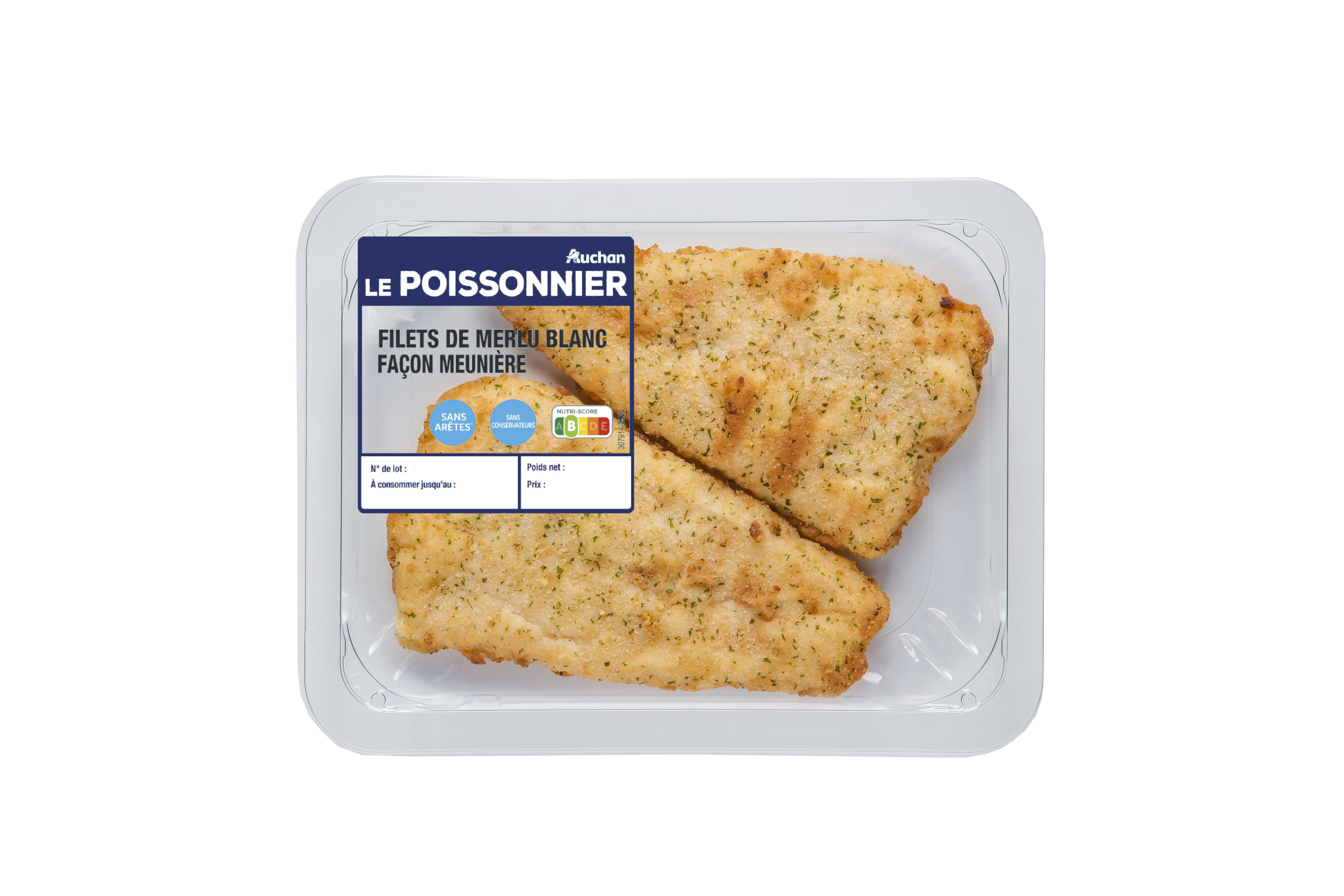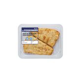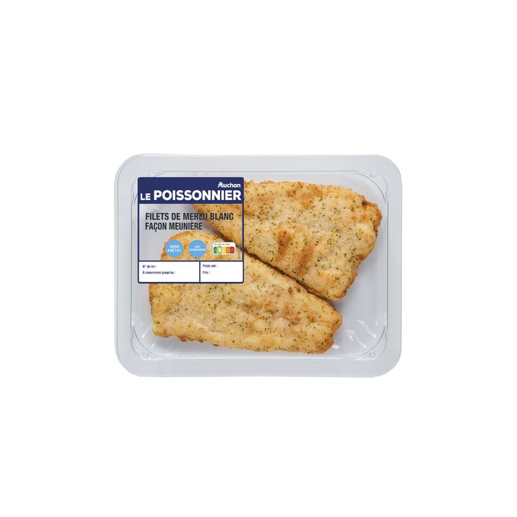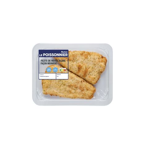 Filets de merlu blanc façon meunière, sans arêtes, préfrits, cuits, réfrigérés