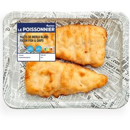 Filets de merlu blanc du Cap sans arêtes, enrobés d’une pâte à beignet, préfrits, cuits, réfrigérés