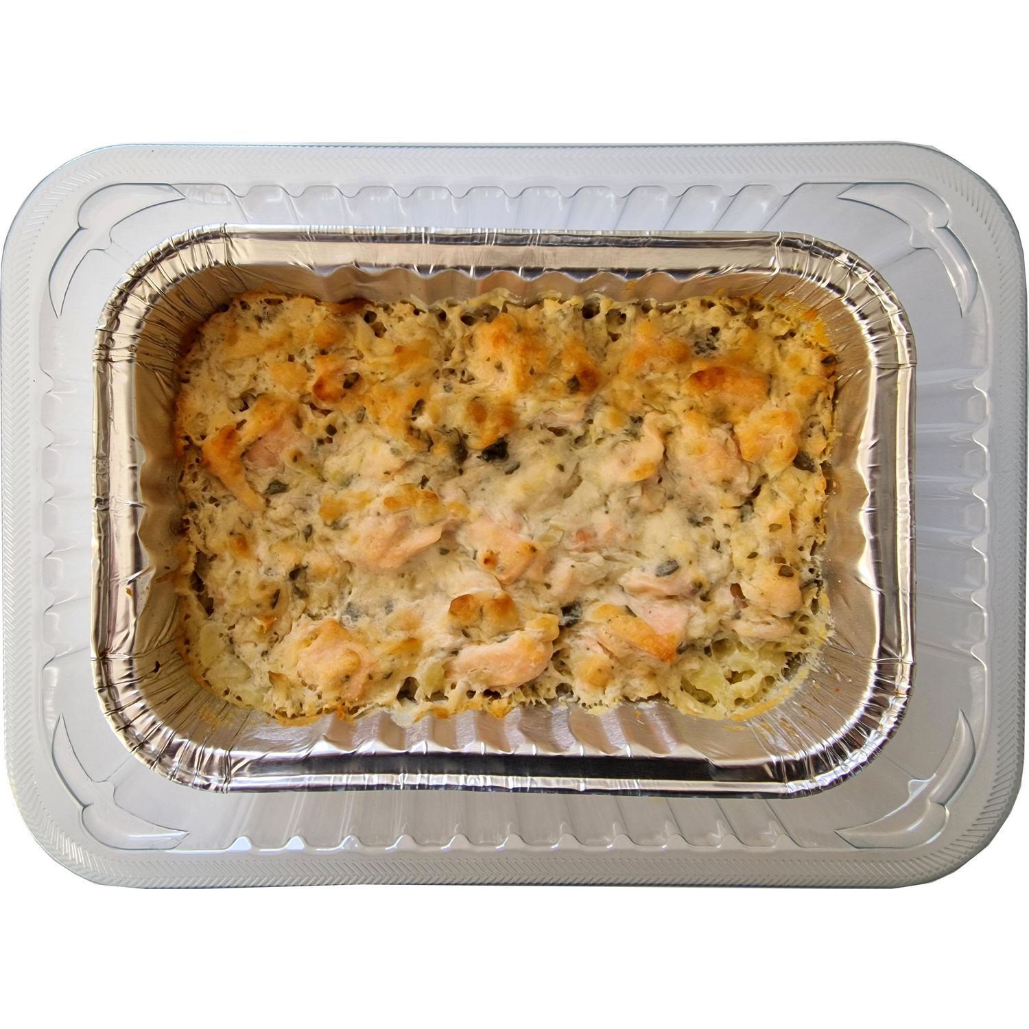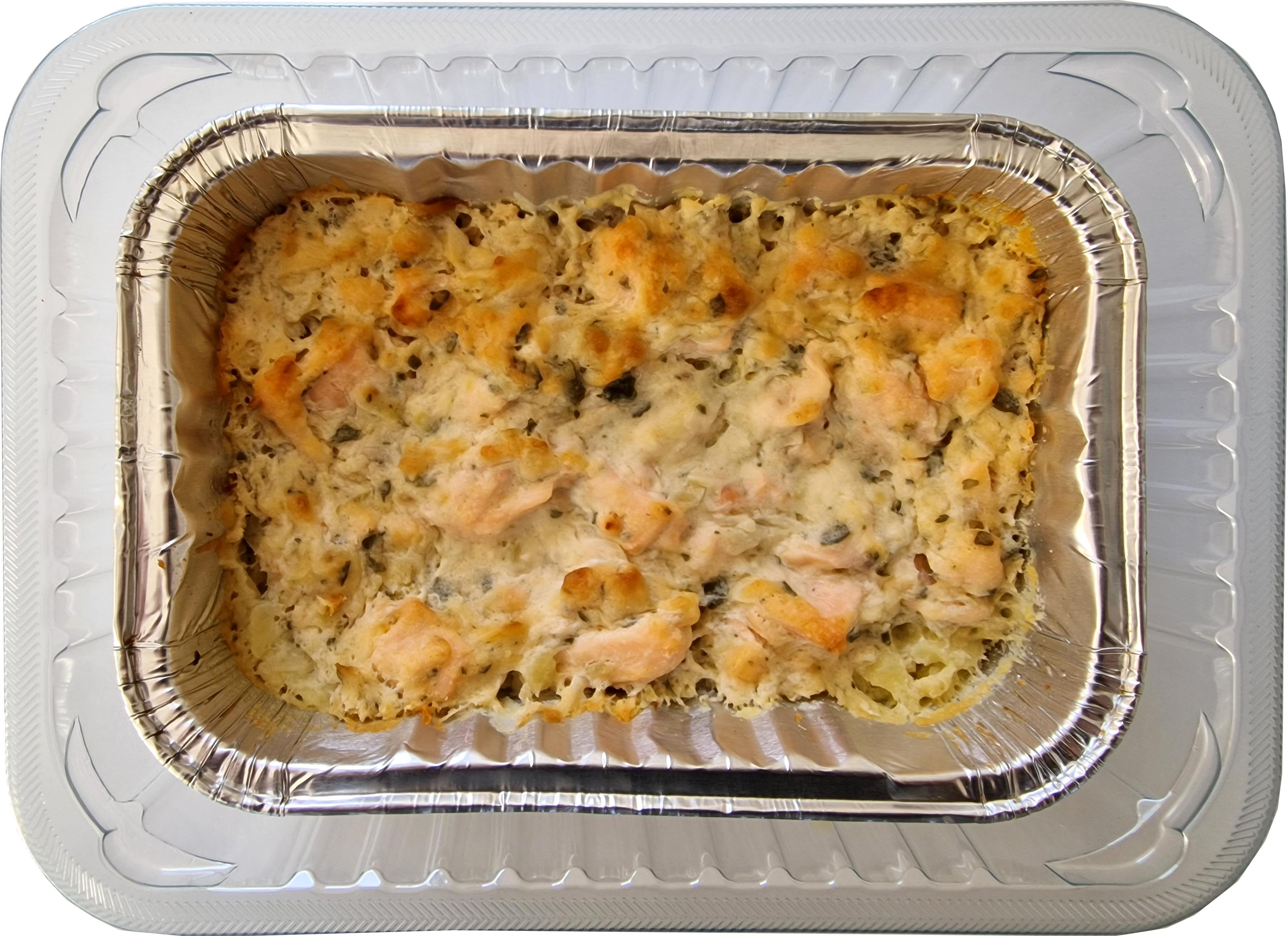 Pommes de terre 36%, saumon (poisson) (salmo salar) 27%, crème fraiche (lait) 12%, lait (lait) 8%, oignons 4%, blanc de poireau 3,5%, huile de colza 2%, beurre (lait) 2%, farine de blé (gluten) 1,5%, purée d'ail 1,4%, crème liquide (lait) 1%, jus de citron jaune, huile d'olive, sel, arômes naturels de poivre, échalote, persil.