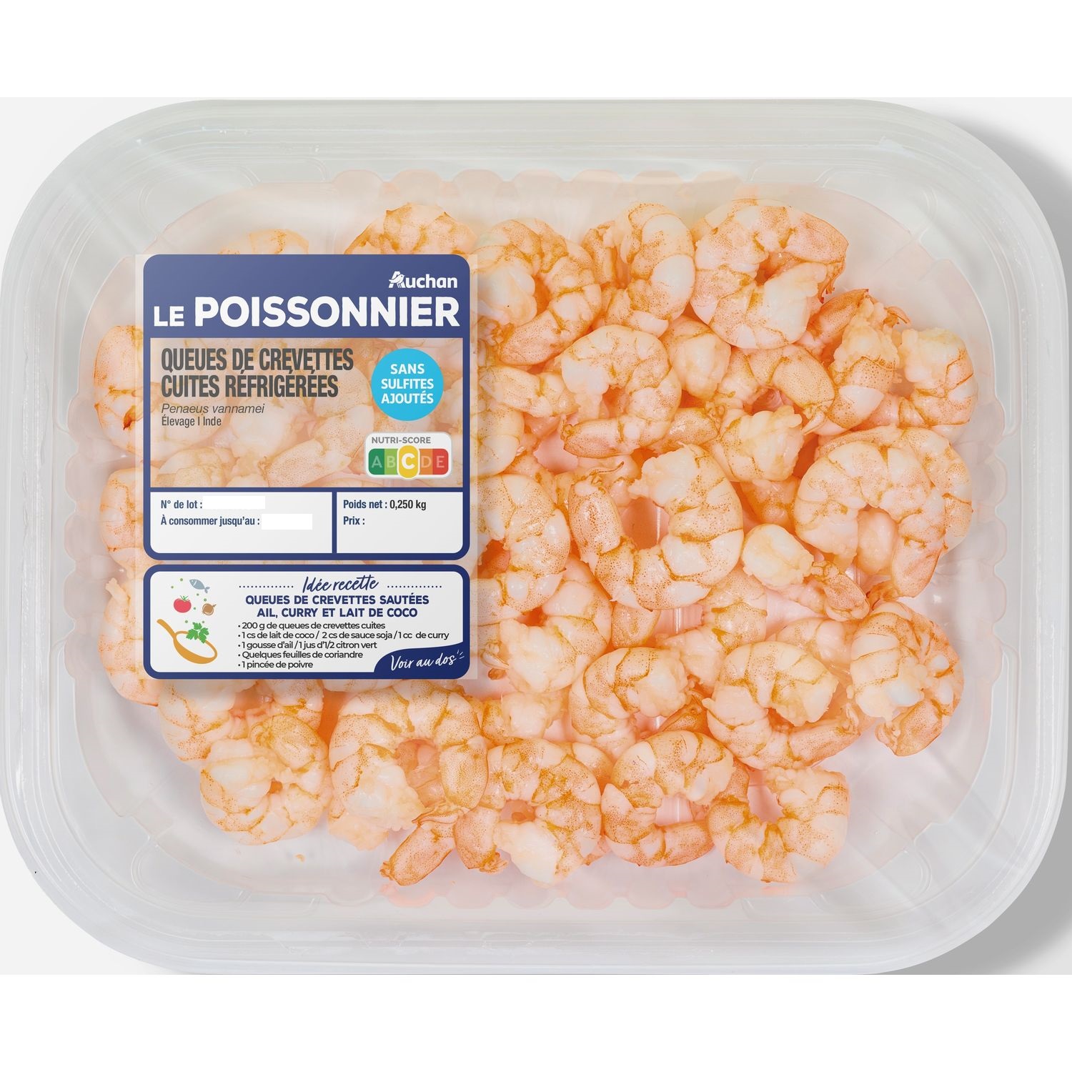 crevettes décortiquées cuites barquette de 250 g sans sulfite ajouté