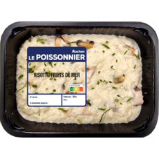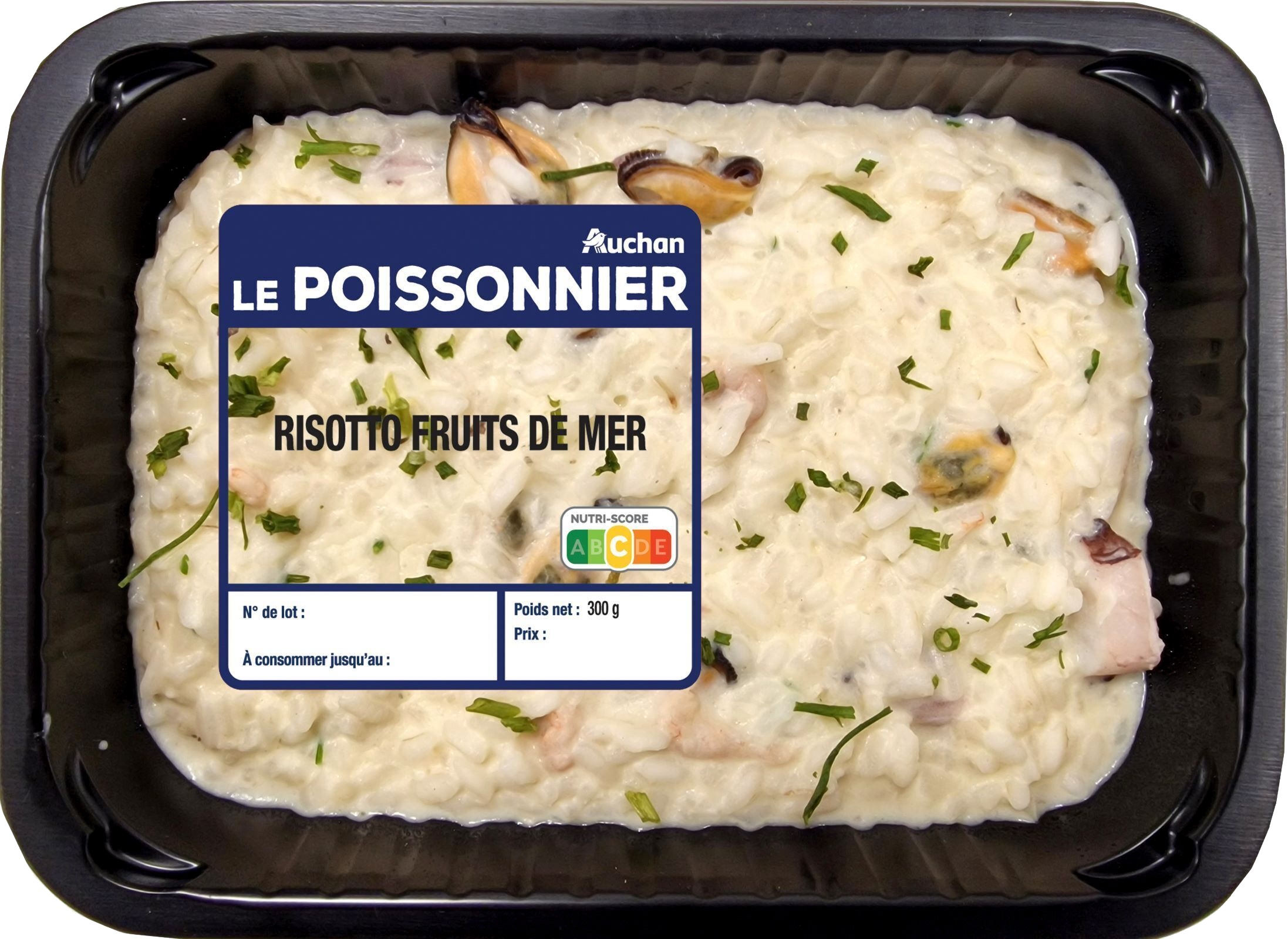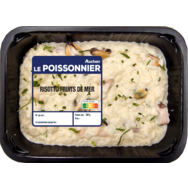 Riz arborio 50%, fruits de mer cuisinés 16% (fruits de mer 12% (moules (mollusque) (mytilus chilensis, sel) 7%, encornet (mollusque) (Loligo duvaucelii, sel) 2%, crevettes (crustacés) décortiquées (Penaeidae, sel, correcteur d’acidité E-331) 2%), crème fraîche (lait) 2,4%, huile de colza, purée d'ail, persil, amidon de maïs, sel, arôme naturel de poivre), crème liquide (lait) (crème, stabilisant: carraghénanes) 16%, oignons jaunes, vin blanc sec, huile d'olive, parmesan (lait) 3%, sel, arôme naturel de poivre, échalote, ciboulette.