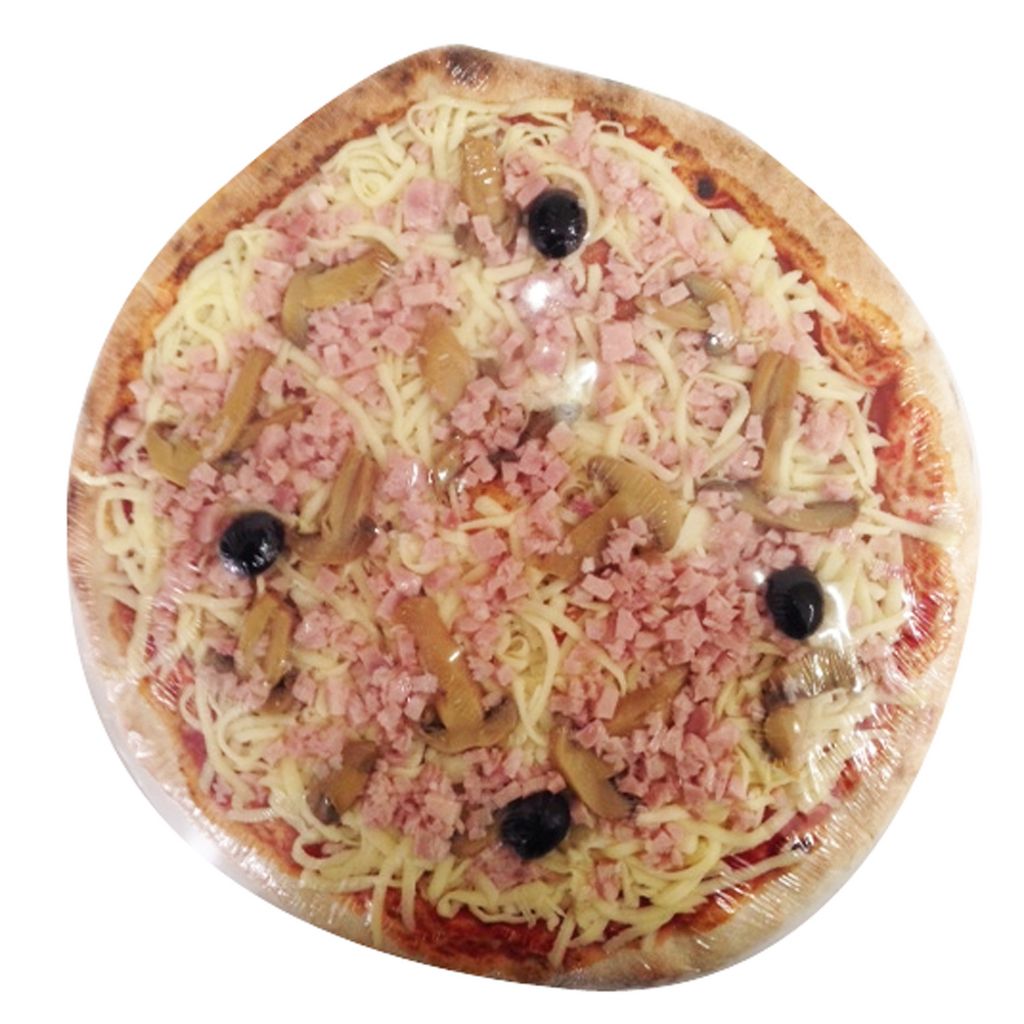 Pizza de 29 cm de diamètre environ, précuite et garnie de jambon cuit et de champignons Pizza à base de jambon cuit et champignon
