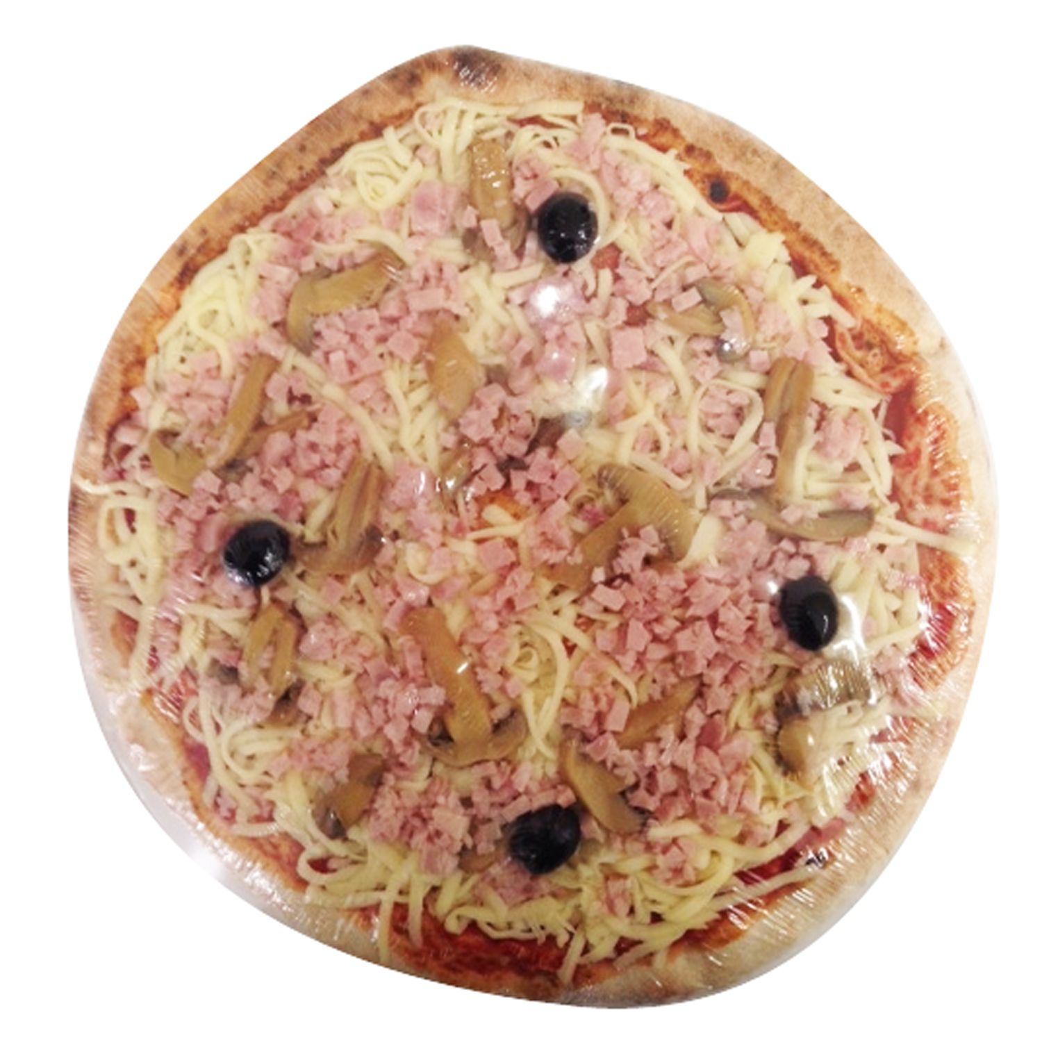 Pizza de 29 cm de diamètre environ, précuite et garnie de jambon cuit et de champignons
