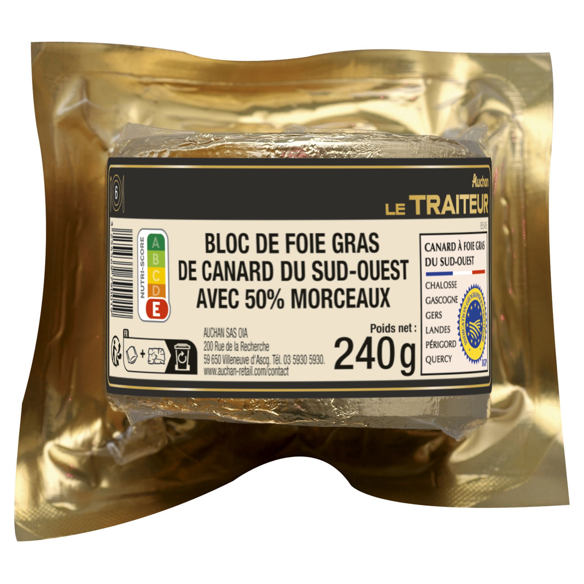 Foie gras de canard du Sud Ouest (origine France), morceaux de foie gras de canard du Sud-Ouest (origine France) 50%, eau, sel, Armagnac, sucre, épices, antioxydant : ascorbate de sodium, conservateur : nitrite de sodium