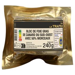 Un bloc de foie gras de canard avec 50% de morceaux issus de canards nés et élevés en France, facile à préparer et à trancher, pour 6 à 8 personnes