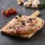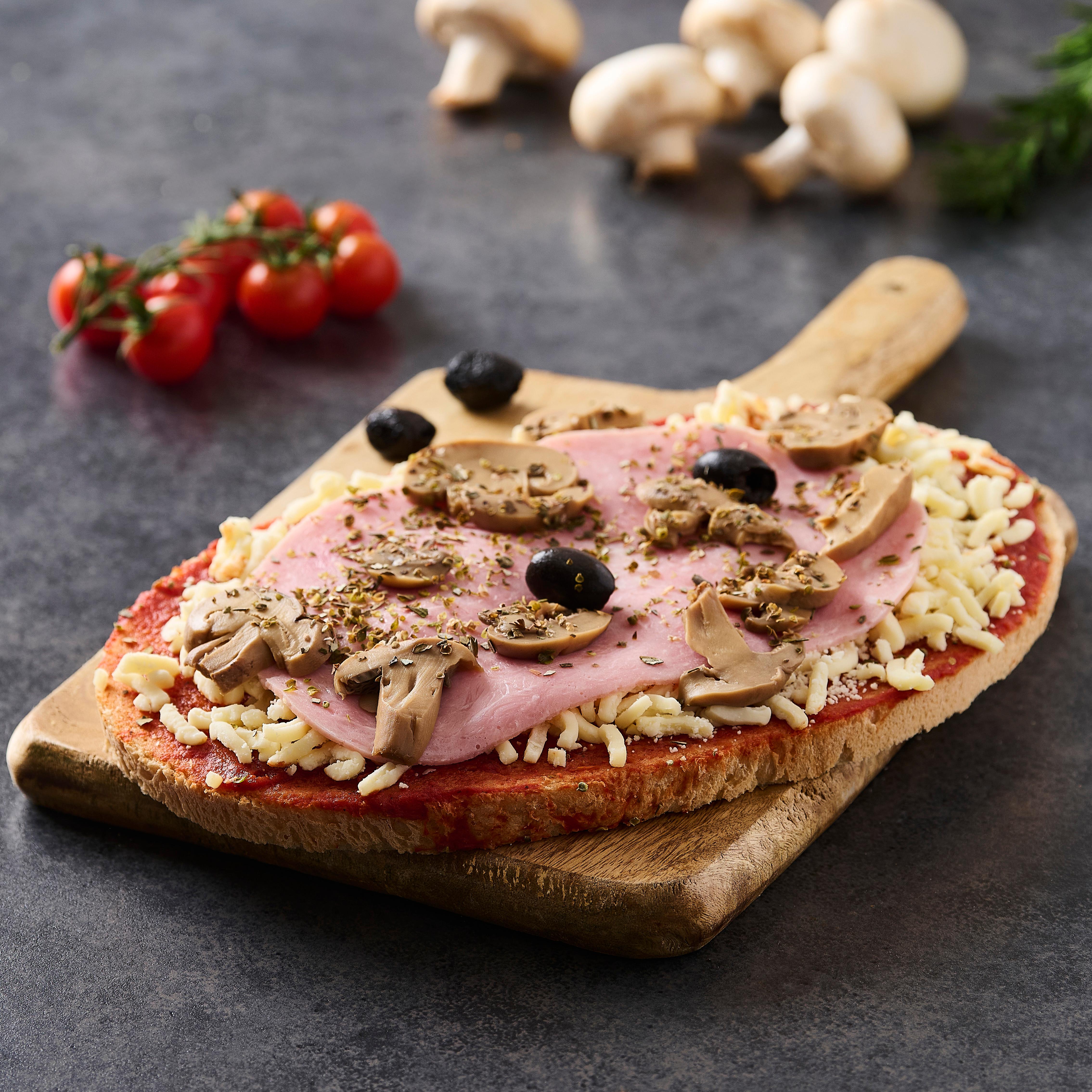 bruschetta 28,8% (farine de BLE, eau, huile d'olive, sel,levure, farine de cereales maltees (dont BLE)), jambon cuit 20,1% (jambon de porc, sel, dextrose, aromes, antioxygene: E301, conservateur: E252), mozzarella râpée 20,1% (LAIT de vache pasteurisé (origine UE), protéines de LAIT, sel, correcteur d'acidité : E330, ferments LACTIQUES, coagulant microbien, conservateur : E202, anti agglomérant : amidon), sauce à pizza 20,1% (98 % tomates, sel, huile de tournesol, sucre, herbes aromatiques, ail, régulateur d'acidité : E330), champignons 8,6% (champignons, eau, sel, acidifiant : E330, antioxydant : E300), olives noires dénoyautées (olives, eau, sel, stabilisant : E579).