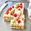 crème mascarpone 41,5% (crème au mascarpone (CREME(LAIT) (35% matiere grasse) 59,2%, mascarpone (CREME 40% matiere grasse, correcteur d'acidite : E330) 40%, amidon modifie, stabilisant : E412 E407), sucre), feuille suprême nature (OEUFS entiers, sucre, farine de BLE, eau, blanc d’OEUF (blanc d’OEUF, épaississant : E415), stabilisant : E420 E422, fibres d’AVOINE, émulsifiant : E472b E477 (sirop de glucose, poudre de LAIT écrémé, LAIT), poudre à lever : E450 E500 (BLE)), coulis framboise gélifié(puree de framboise(pulpe de framboise 90%, sucre), framboise 1,4%, gelatine bovine ), macaron framboise (sucre, AMANDES, sucre glace, blanc d'OEUF, framboises 13,1%, colorant : rouge de betterave, gelifiant : pectine, jus de citron.), sirop(eau, sucre), fraises, framboise 1,7%, groseille 1,7%, Decor feuille verte (chocolat blanc (sucre, beurre de cacao, LAIT entier en poudre, émusilfiant : lécithine de SOJA, arôme naturel de vanille) amidon de maïs, colorants : E100, E133), chocolat noir (masse de cacao, sucre, beurre de cacao, emulsifiant : lecithine de SOJA, arome naturel de vanille), myrtilles 0,9%, Meringuette parfum fraise (blancs d'OEUFS, sucre, sucre glace (sucre 97%, amidon de mais 3%), arôme fraise (préparation(s) aromatisante(s), eau, E1520, E415, substance(s) aromatisante(s) naturelle(s), E211)), meringuette vanille (blancs d'OEUFS, sucre, sucre glace (sucre 97%, amidon de mais 3%), extrait naturel vanille (sirop de fructose, préparation aromatisante (extrait de vanille), E1520, caramel)).