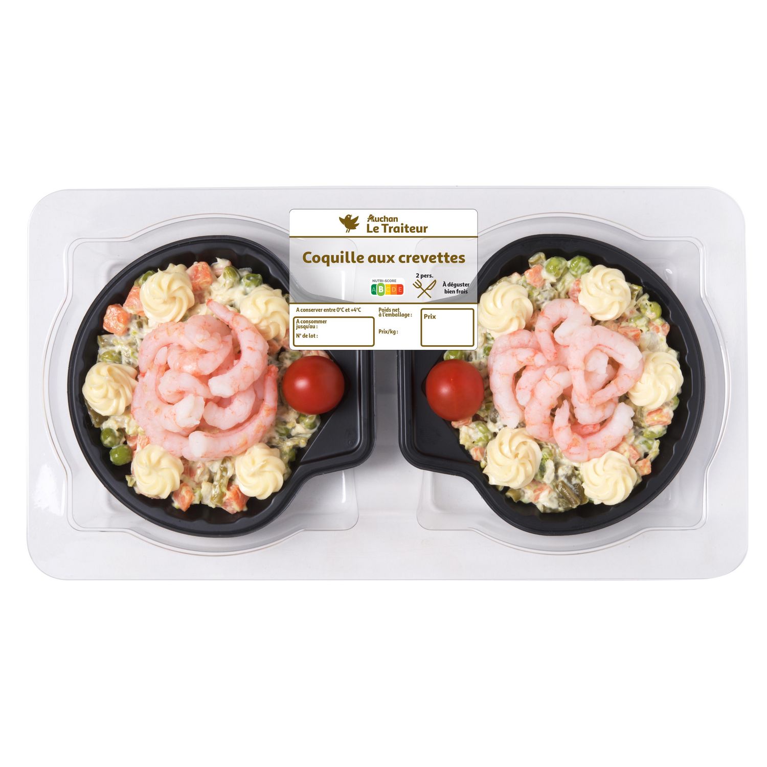 14% (crevettes (Pandalus borealis), sel), tomate cerise, eau, moutarde (eau, graines de moutarde,