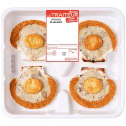 Coquille garnie de noix de Saint-Jacques *(Zygochlamys patagonica, origine Argentine ou Chlamys opercularis origine Royaume uni) accompagnée d’une sauce à base de champignon et de CREME légère.