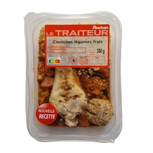 Ingrédients : Eau, haut de cuisse de poulet 22,4% (Origine UE), semoule de BLE dur 8,7% (Origine France), carotte 8,6%, merguez